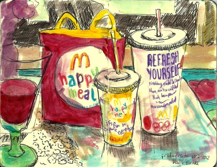 A large McChicken meal with coke; a cheeseburger with large fries and a fanta; a quarter pounder meal with coke; an apple pie; and a Happy Meal with three chicken nuggets and a boy toy.